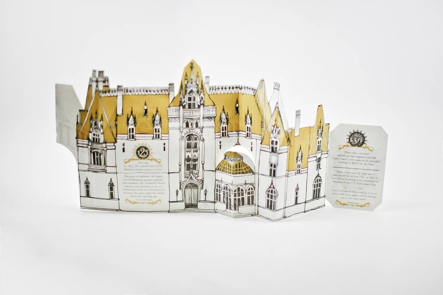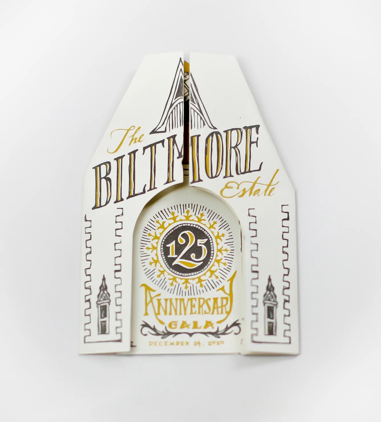 The concept behind the piece was to emulate the expereince of someones first encounter with the breathtaking estate. After recieving the simple envelope, the person pulls the piece from the sleeve to reveal an elegant gilded rendition of the Estate’s front gate with elaborate handlettered invitation displayed across the front. Then, similar the to the astounding experience of pulling through the gates of the estate and driving up the long driveway to finally have the facade of the massive mansion come into view, the gates of the invitation open and unfold to reveal a beautiful multi-dimentional illustration of the massive architectural wonder. An RSVP and envelope are contained inside and can easily be detached and mailed back to the estate while the rest of the piece can be kept as a memento of the event.