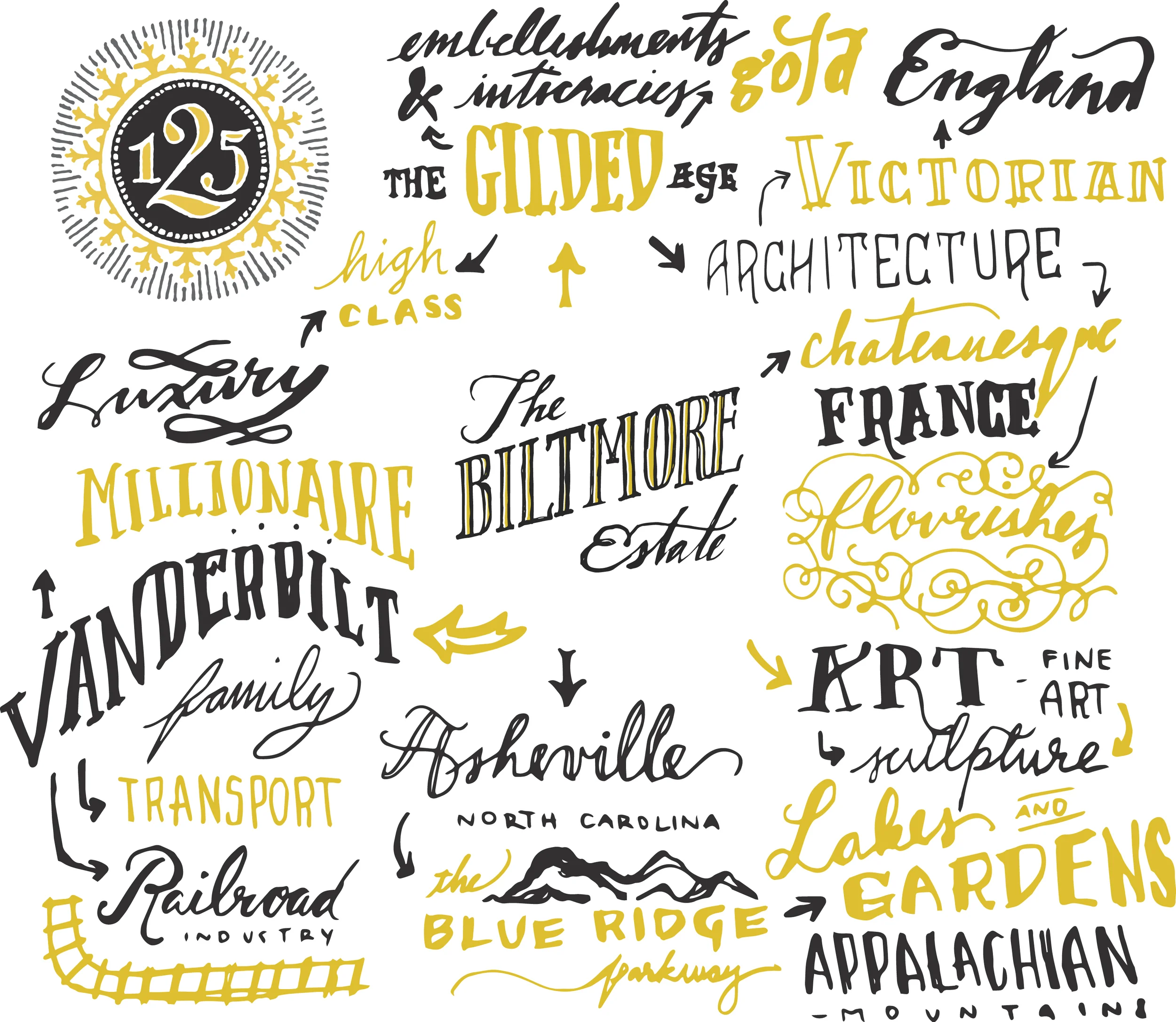 For my piece, I chose to create an invitation to a gala for the 125 Anniversary of the Biltmore Estate in Asheville, North Carolina, hosted by the legendary Vanderbilt Family. The invitations mimic the elegant, flourishing designs of the Gilded Age in Late Eighteenth Century America with a modern flair and hand-drawn elements and illustrations.